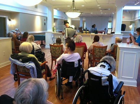 Each visit began with a tour. We walked the inner loop of the facility, which included an ice cream parlor, a movie box office with posters from the 1950s, a dress shop, a tool shop, a barbershop, and more. The circular design gave residents the confidence of always having somewhere to go, rather than leading them to a confusing dead end. This familiar, indoor “downtown” setting offered residents opportunities to try on clothes, eat ice cream or popcorn, and have their hair cut by a visiting stylist while seated in a barbershop chair. I absolutely loved this creative space and have yet to see another one quite like it.