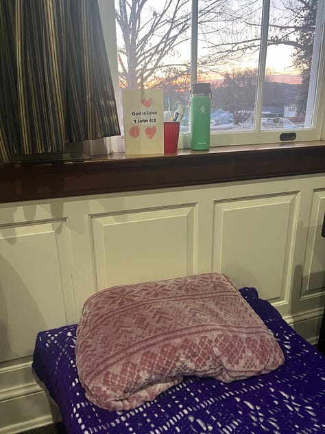 Mary and I stayed connected throughout that December as the thermal shelter rotated between churches. Guests arrived by 6:00 p.m. and had to leave by 7:00 a.m. each morning. I offered Mary rides from rural churches back to her daytime spot downtown. Most mornings it was just the two of us, though sometimes my daughters or our dog rode along. During those rides, I began to learn about her hometown, her family, her faith, and her previous work.